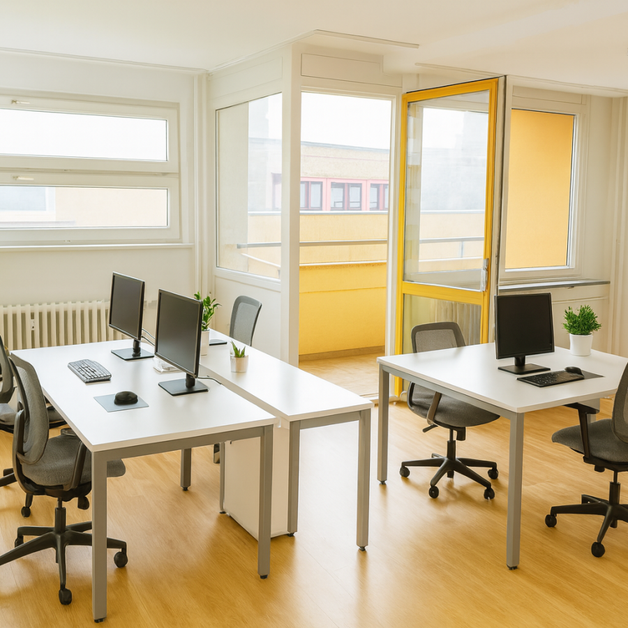 Das Büro bietet einen großzügigen Grundriss mit großen Fenstern, viel Licht und einem Balkon, der Ihnen eine außergewöhnliche Atmosphäre für Ihre Arbeit bietet.