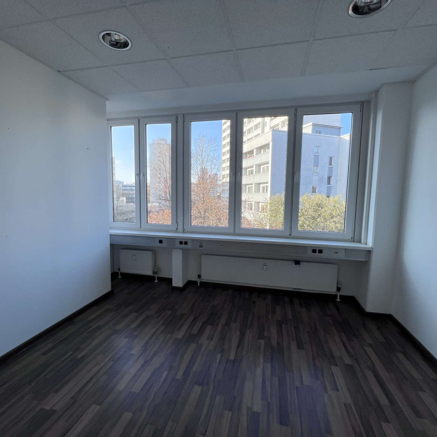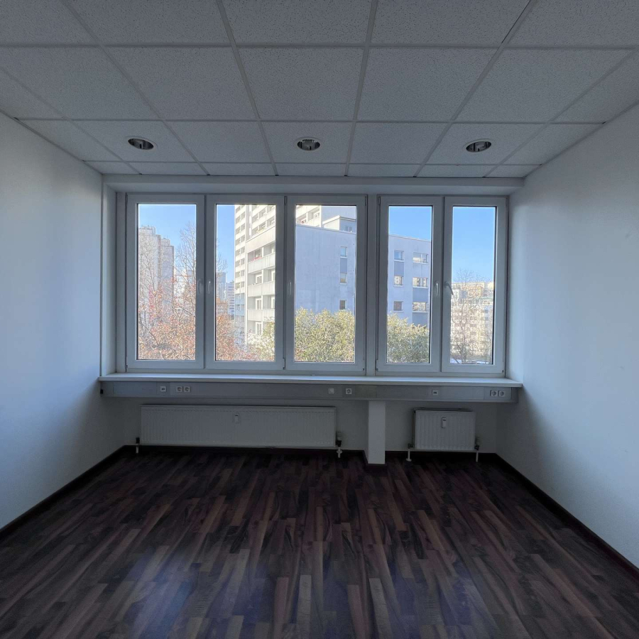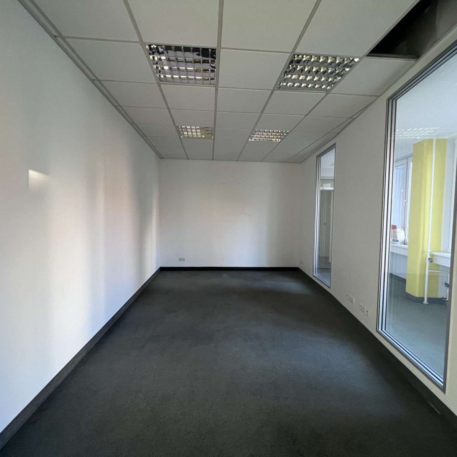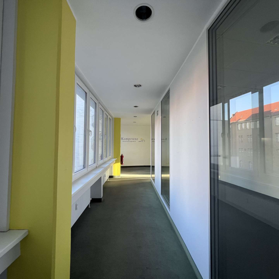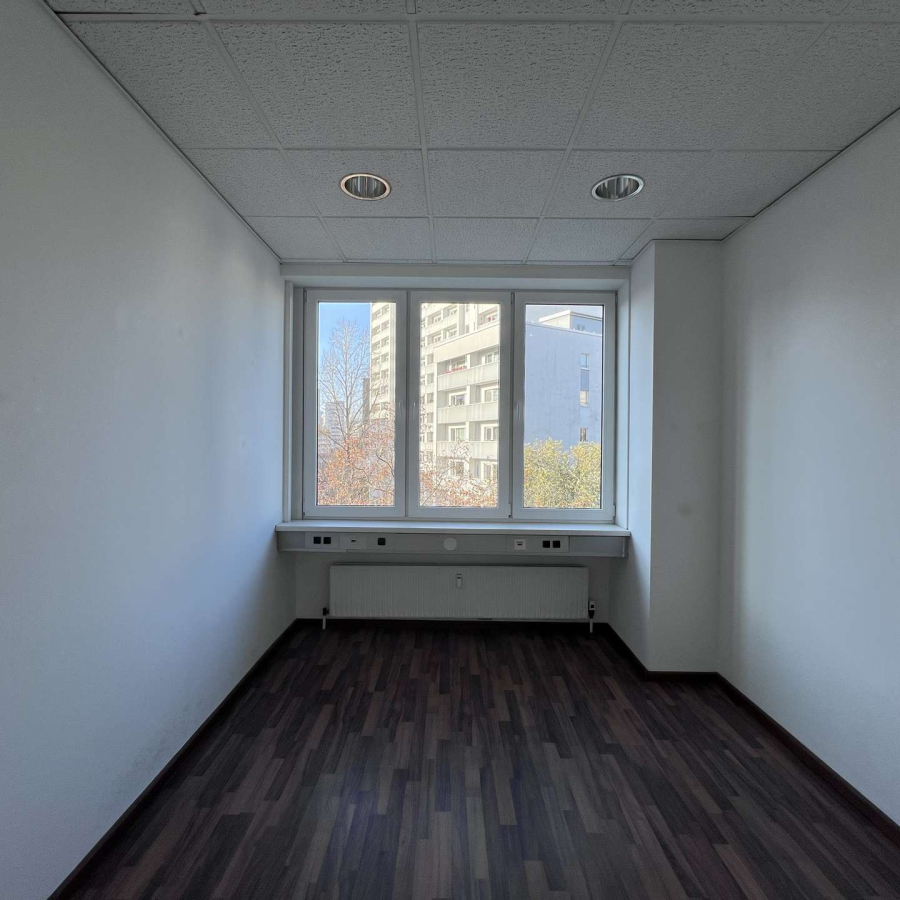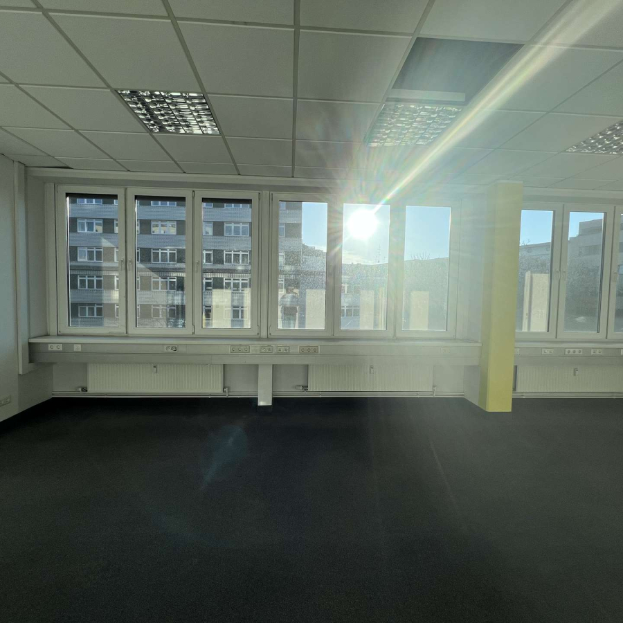 Die Räume präsentieren sich lichtdurchflutet und verfügen über hochwertige elektrische Außenjalousien, die eine komfortable Licht- und Sichtregulierung ermöglichen. Ein moderner Bodenbelag in ansprechendem Design sorgt für ein professionelles und angenehmes Arbeitsumfeld.
