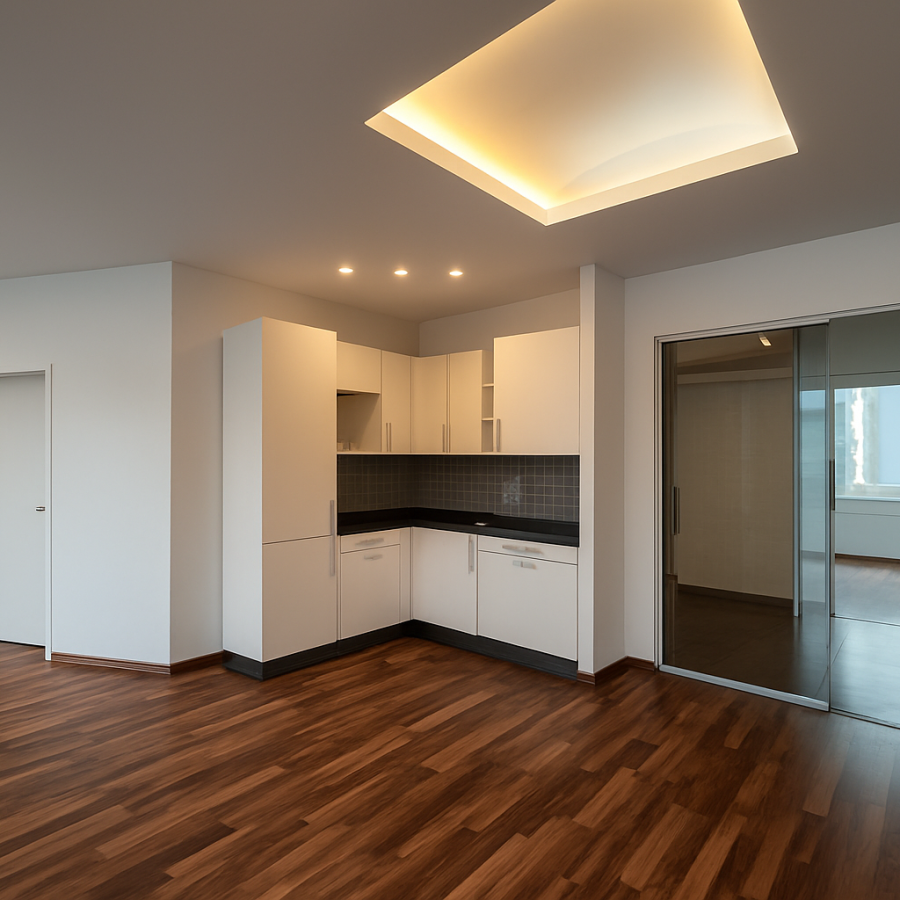 Die modernen Sanitäranlagen entsprechen aktuellen Standards und unterstreichen den gepflegten Gesamtzustand der Einheit. Eine bereits vorhandene Einbauküche bietet zusätzlichen Komfort im täglichen Arbeitsablauf.