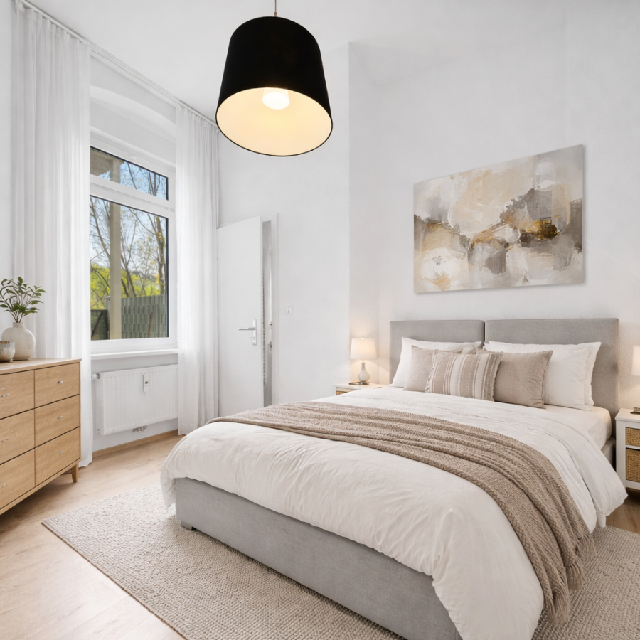 Die moderne Einbauküche ist bereits im Kaufpreis enthalten und ermöglicht einen sofort komfortablen Einzug ohne zusätzliche Investitionen. Das Schlafzimmer bietet ausreichend Platz für eine erholsame Nachtruhe, während das Bad funktional und gepflegt gestaltet ist.