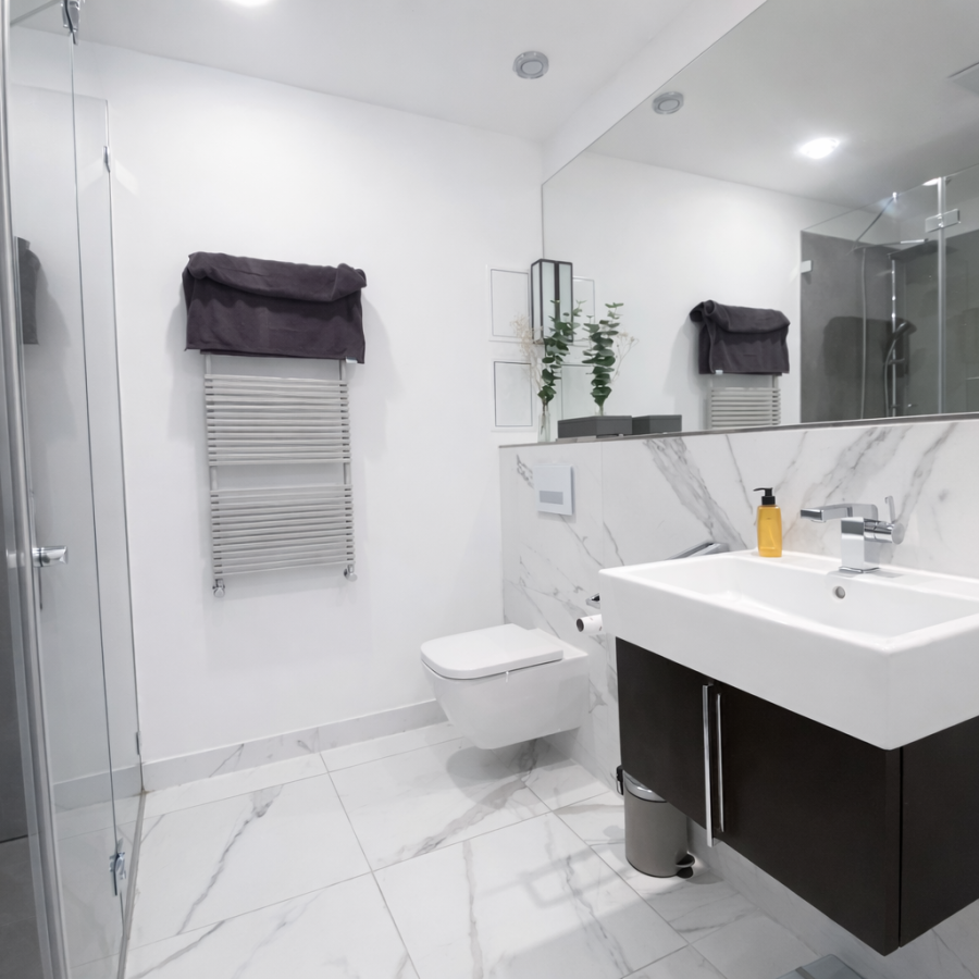 Das Badezimmer ist modern gestaltet und verfügt über eine Dusche.