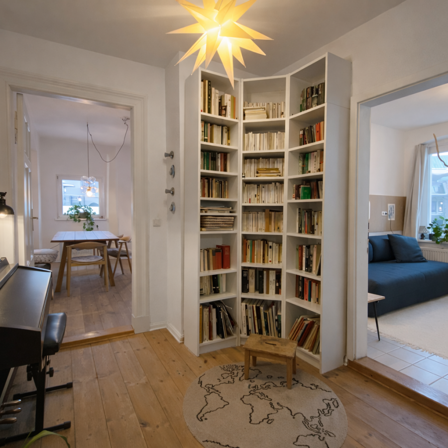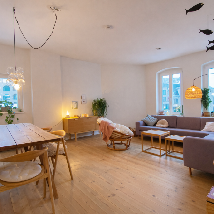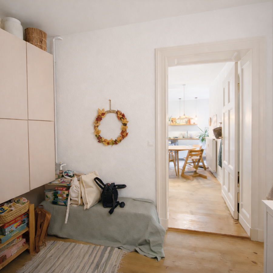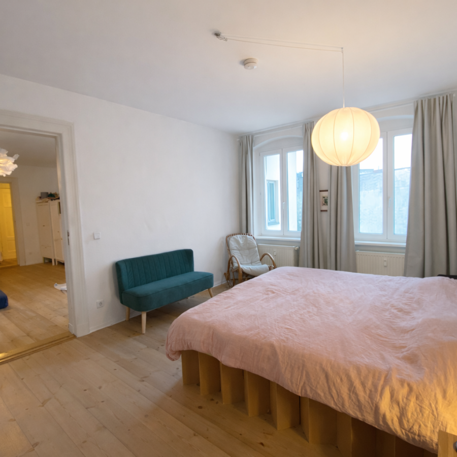 Diese charmante Wohnung verfügt über drei Schlafzimmer und einen besonderen, gut durchdachten Grundriss. Hohe Decken und ein schöner Dielenboden verleihen der Wohnung eine helle, gemütliche und zugleich großzügige Atmosphäre.