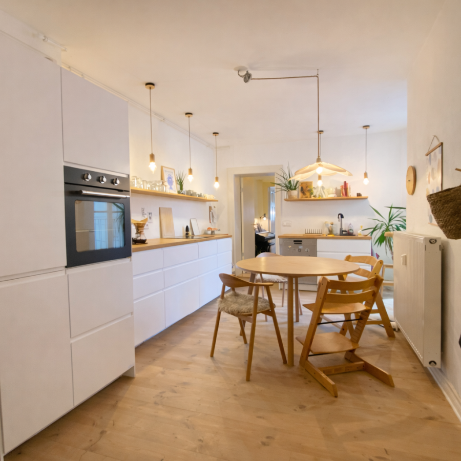 Ergänzt wird das Raumangebot durch eine separate Küche, die groß genug ist, um einen Esstisch zu integrieren und somit angenehm begehbar ist. Eine Einbauküche ist vorhanden und kann vom aktuellen Mieter übernommen werden (weitere Informationen hierzu gerne vor Ort).